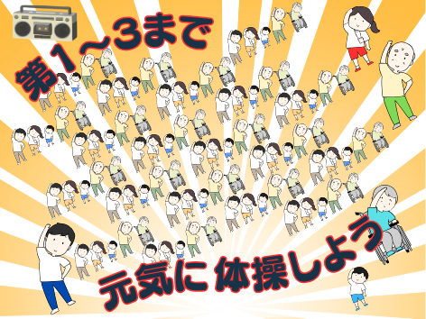 ラジオ体操の第1から第3までを、どまりばの体操シスターズと一緒に行います!それぞれのミニレクチャータイムもあるよ!