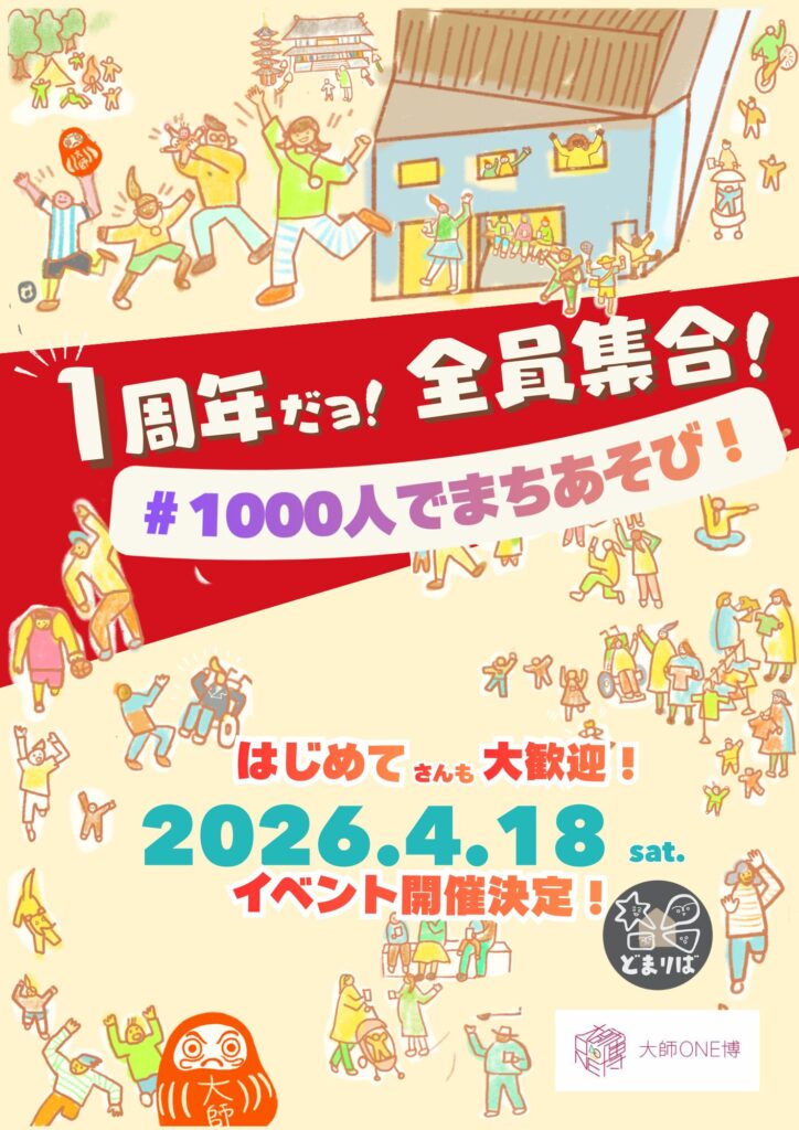 4月18日(土)どまりば1周年イベント開催決定!! 2026年3月19日 最終更新日時 : 2026年3月20日 daishi-onepark #1000人でまちあそび 楽しい企画が盛りだくさん!!ワクワク待っててくださいね♡ \ 最新情報をチェック /