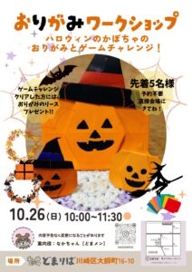 おりがみワークショップ 2025年9月24日 最終更新日時 : 2025年9月24日 daishi-onepark 日付: 2025年10月26日 時間: 10:00 - 11:30 カレンダー: どまりばイベントカレンダー 案内役:なかちゃんハロウィンのかぼちゃのおりがみと ゲームチャレンジ! クリアした方には、おりがみのリースプレゼント!! ※展示会も同時開催 参加費:無料 予約不要・先着5名様/直接どまりばに来てね! 内容予告なく変更になることがあります。 ご了承ください。