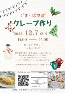 クレープ作り 2025年11月16日 最終更新日時 : 2025年11月16日 daishi-onepark 日付: 2025年12月7日 時間: 14:00 - 15:00 カレンダー: どまりばイベントカレンダー 主催:食育アドバイザー りょうちゃん 自然農法の米粉でもちもちクレープをみんなで作って食べよう!お子さんと!お友達と!大人も子どももどなたでもご参加いただけます! 参加費 1人1000円➕カフェワンドリンク代 事前予約制→お申込みはこちら