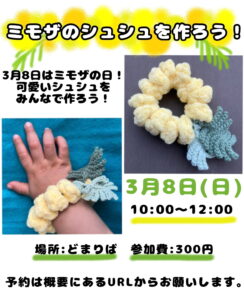 ミモザのシュシュを作ろう! 2026年2月20日 最終更新日時 : 2026年2月21日 daishi-onepark 日付: 2026年3月8日 時間: 10:00 - 12:00 カレンダー: どまりばイベントカレンダー 主催:コマ 髪ゴムにパーツを通してミモザのシュシュを作るワークショップです。 参加費:300円 事前予約制/お申込みはこちら